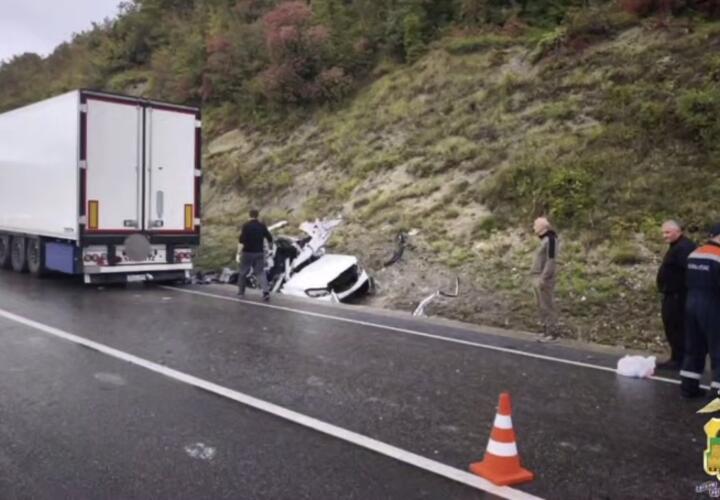 На горной трассе «Джубга–Сочи» произошла страшная авария: Mercedes вылетел на встречную полосу и врезался в грузовик Volvo с прицепом. От удара легковой автомобиль превратился в груду металла.