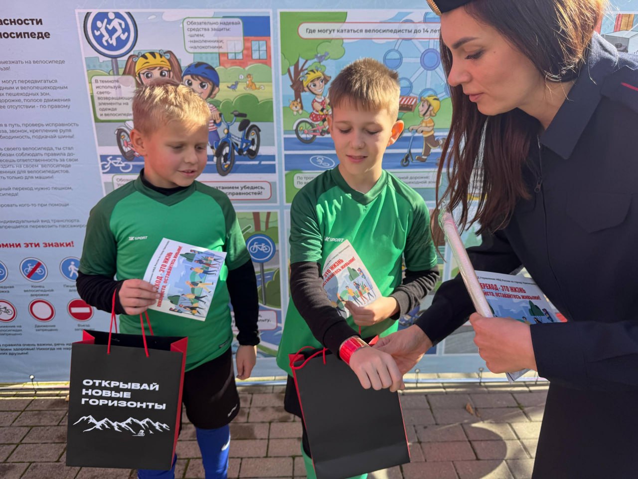 Сотрудники Госавтоинспекции города Краснодара совместно с представителями БайкЦентра организовали для детей интерактивную игруквест по правилам дорожного движения в перерывах детского футбольного турнира.