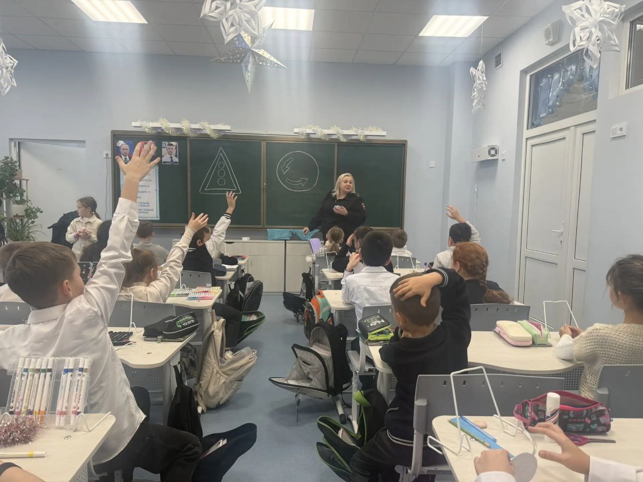 Автоинспектор напомнила ребятам о поведении в дорожно-транспортной среде зимой, вместе с ребятами разобрала ошибки пешеходов и дорожные «ловушки», а также призвала учащихся носить световозвращающие элементы в тёмное время суток и условиях недостаточной видимости.