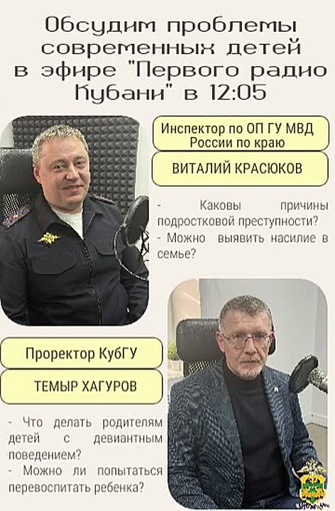 Инспектор по особым поручениям УУП и ПДН майор полиции Виталий Красюков и проректор КубГУ профессор Темыр Хагуров расскажут о том, как вовремя выявить проблемы подростов, дадут рекомендации родителям и педагогам как помочь в разрешении сложных ситуаций.