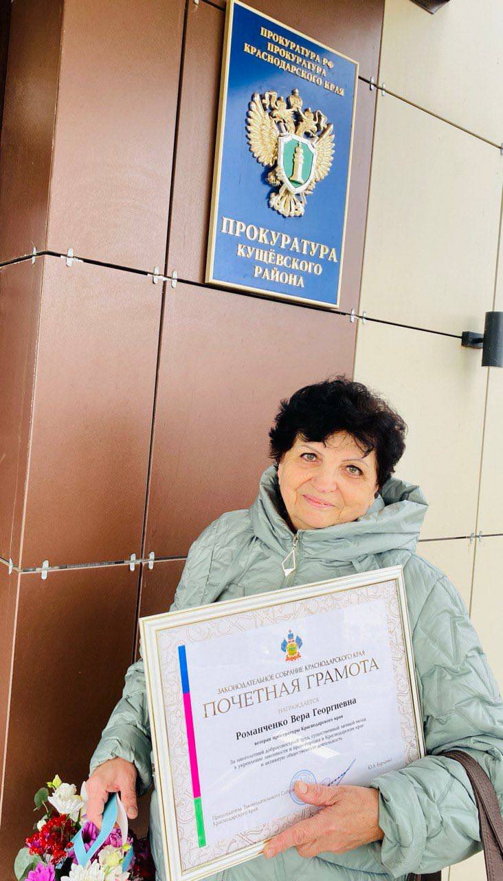 Работники прокуратуры Кущевского района, в том числе молодые специалисты, накануне Международного женского дня 8 марта в торжественной обстановке поздравили находящуюся на заслуженном отдыхе Романченко Веру Георгиевну, многие годы работавшую заведующей канцелярией в прокуратуре района, вручив Почетную грамоту Законодательного Собрания Краснодарского края.