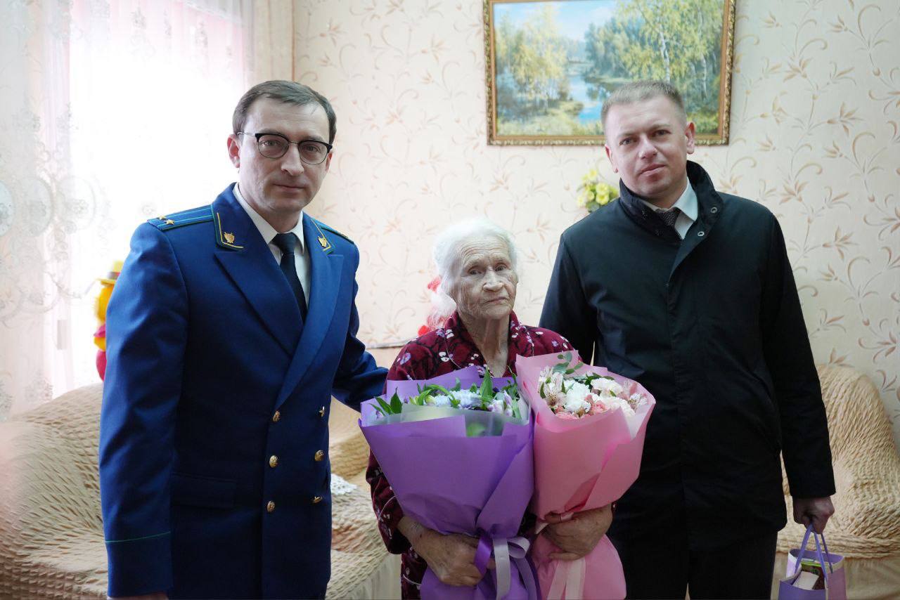 Прокурор Апшеронского района Алексей Попов совместно с главой района поздравил с наступающим праздником Ларису Васильевну Аушеву.