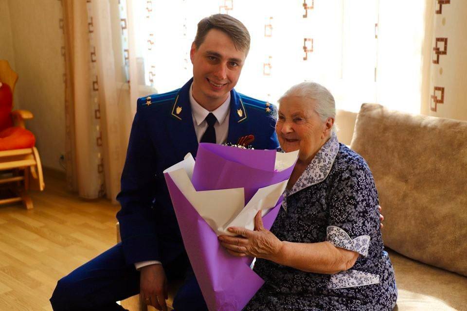 Заместитель прокурора района Василий Безручко пожелал имениннице крепкого здоровья, долгих лет жизни, вручил подарки, поблагодарил за вклад в победу в Великой Отечественной войне.