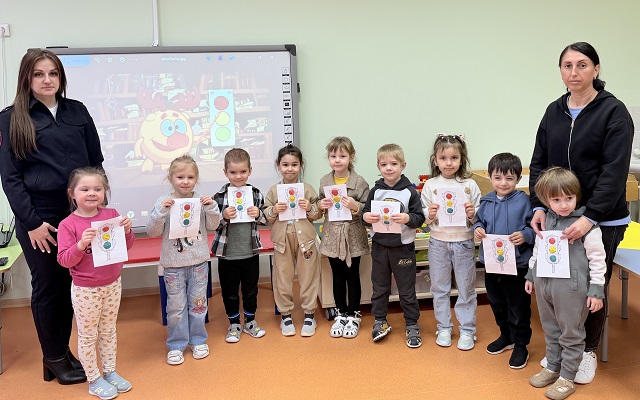 После творческой части прошла оживленная беседа о ПДД. Инспектор в доступной форме напомнил детям о безопасном поведении на дороге: как правильно переходить проезжую часть, где можно играть, и как важно быть внимательными пешеходами. Малыши с готовностью делились своими знаниями и задавали вопросы, демонстрируя заинтересованность в теме.