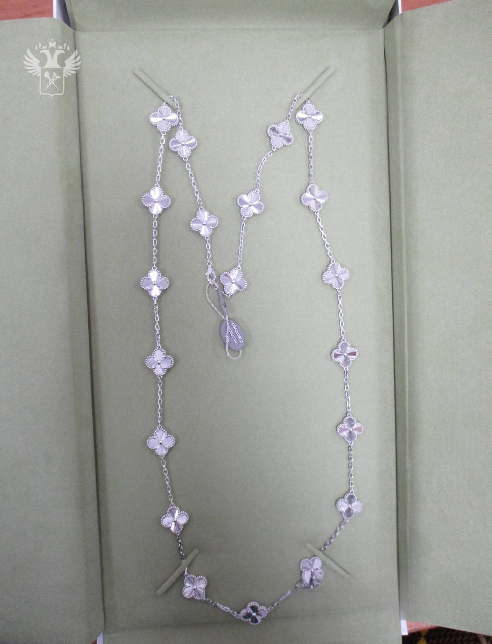 В ходе досмотра в рюкзаке гражданки были найдены серьги с перламутром и колье в виде четырехлистного клевера с гравировкой VanCleef & Arpels из коллекции Vintage Alhambra в фирменных футлярах и коробках зеленого цвета.