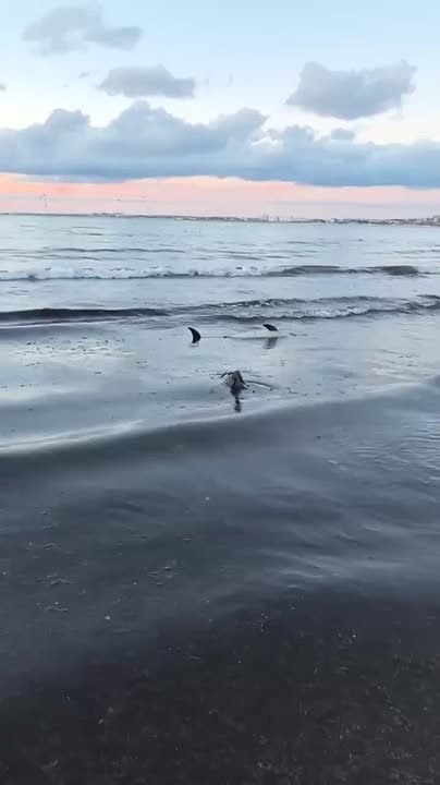 На видео, которое публикуют в соцсетях, видно, как два маленьких дельфина-белобочки лежат на мели в полуживом состоянии. На месте, как сообщают местные СМИ, работают волонтеры.