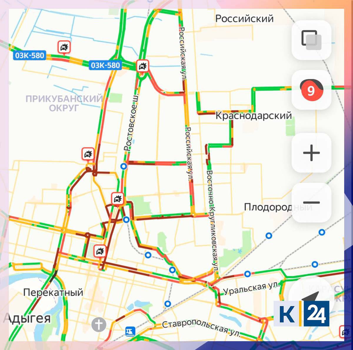 В понедельник вечером краснодарские улицы сковали 9-бальные пробки. Обычно, город утопает в таких заторах по пятницам.
