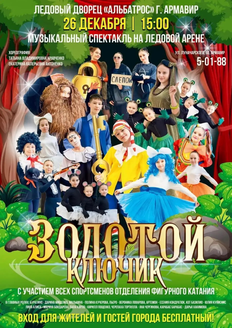 В Ледовом дворце «Альбатрос» 26 декабря пройдёт бесплатный музыкальный спектакль на льду по мотивам повести Алексея Толстого «Золотой ключик». Гостей ледового шоу ждёт встреча с любимыми персонажами детства: озорным Буратино, хитрым котом Базилио, очаровательной Мальвиной, мечтательным Пьеро и многими другими героями сказки. Все роли исполнят спортсмены-фигуристы, демонстрируя своё мастерство на льду.