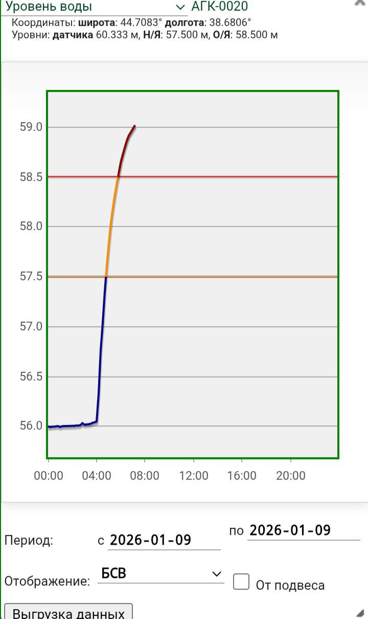 Отметку «Опасное явление» зафиксировал датчик на реке Афипс в ст. Крепостной, «Неблагоприятное явление» — на реке Убин в ст. Азовской.