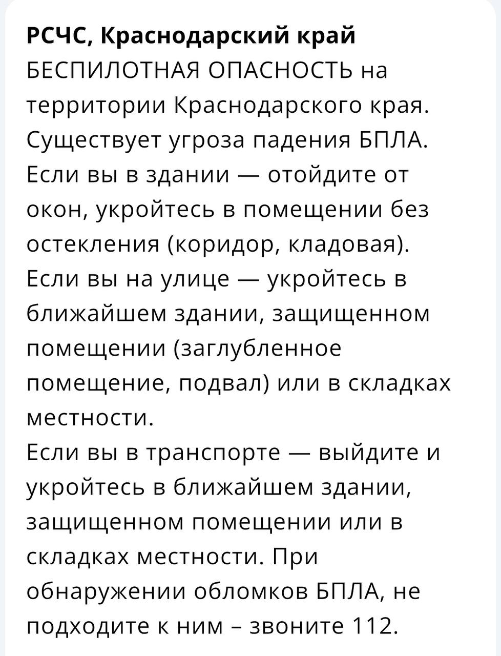 Telegram-канал SHOT заявляет, что в пригороде Краснодара раздались взрывы.Отмечается, что это силы ПВО отражают воздушную атаку украинских БПЛА. По словам местных жителей, около пяти взрывов раздалось на юге города со стороны Северского района...