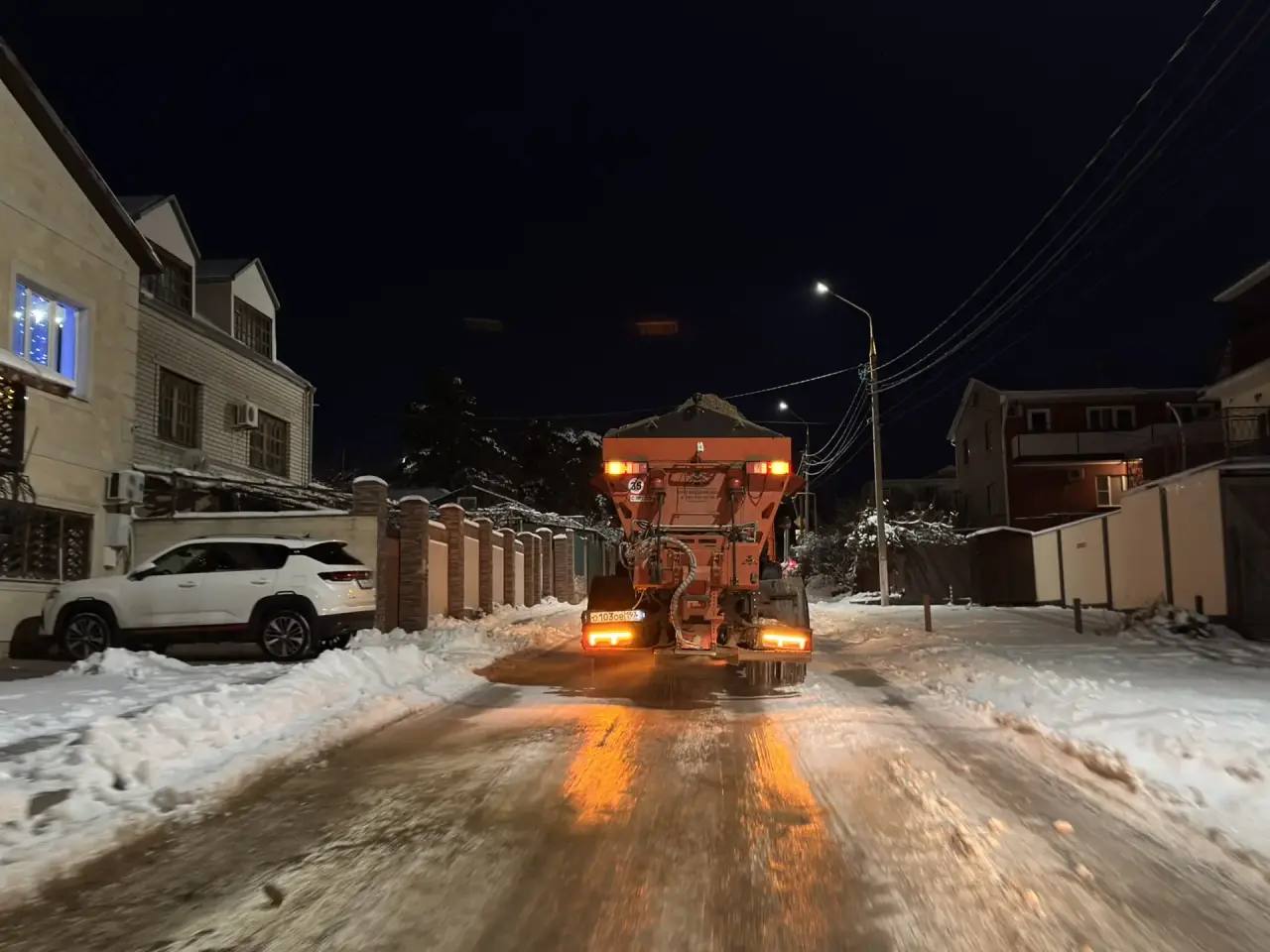 Песко-соляной смесью обработаны улицы в микрорайоне Голубая Бухта - это улицы Пограничная, Взлетная, Просторная, Кипарисовая, Академика Ширшова, работы продолженных по улицам Маршала Жукова, Горная, в мкр. Парус и других районах.