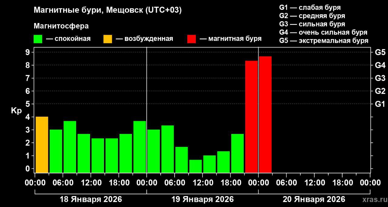 Ночью геомагнитный шторм почти достиг максимального уровня G5. К утру активность бури пошла на спад. По прогнозам специалистов лаборатории солнечной астрономии ИКИ РАН, возмущения магнитного поля планеты могут продлиться в течение всего дня.