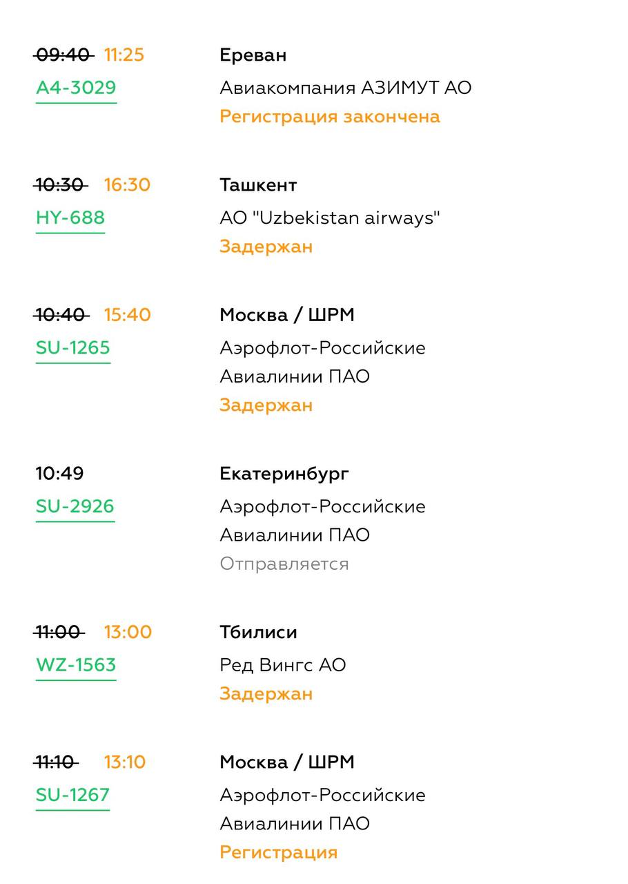На вылет задерживаются восемь рейсов. По одному в Ташкент, Тбилиси, Стамбул, Санкт-Петербург и четыре — в Москву.