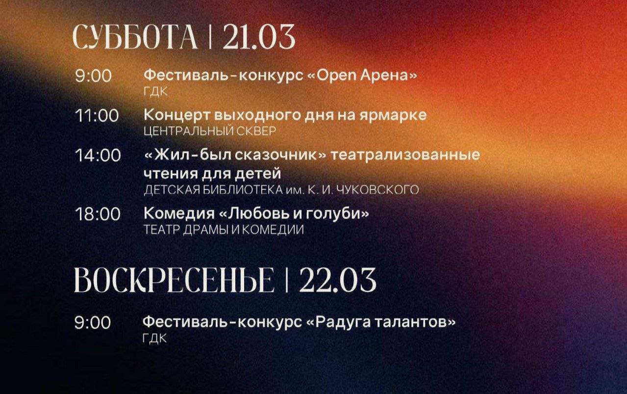 Доброе утро, Краснодар!21 марта в городе облачно, прохладнее, чем в предыдущие дни - до +12°C. Без сильного ветра и осадков.Сегодня для вас открыты ярмарки выходного дня. Также предлагаем ознакомиться с культурной афишей. Телеграм ВК MAX