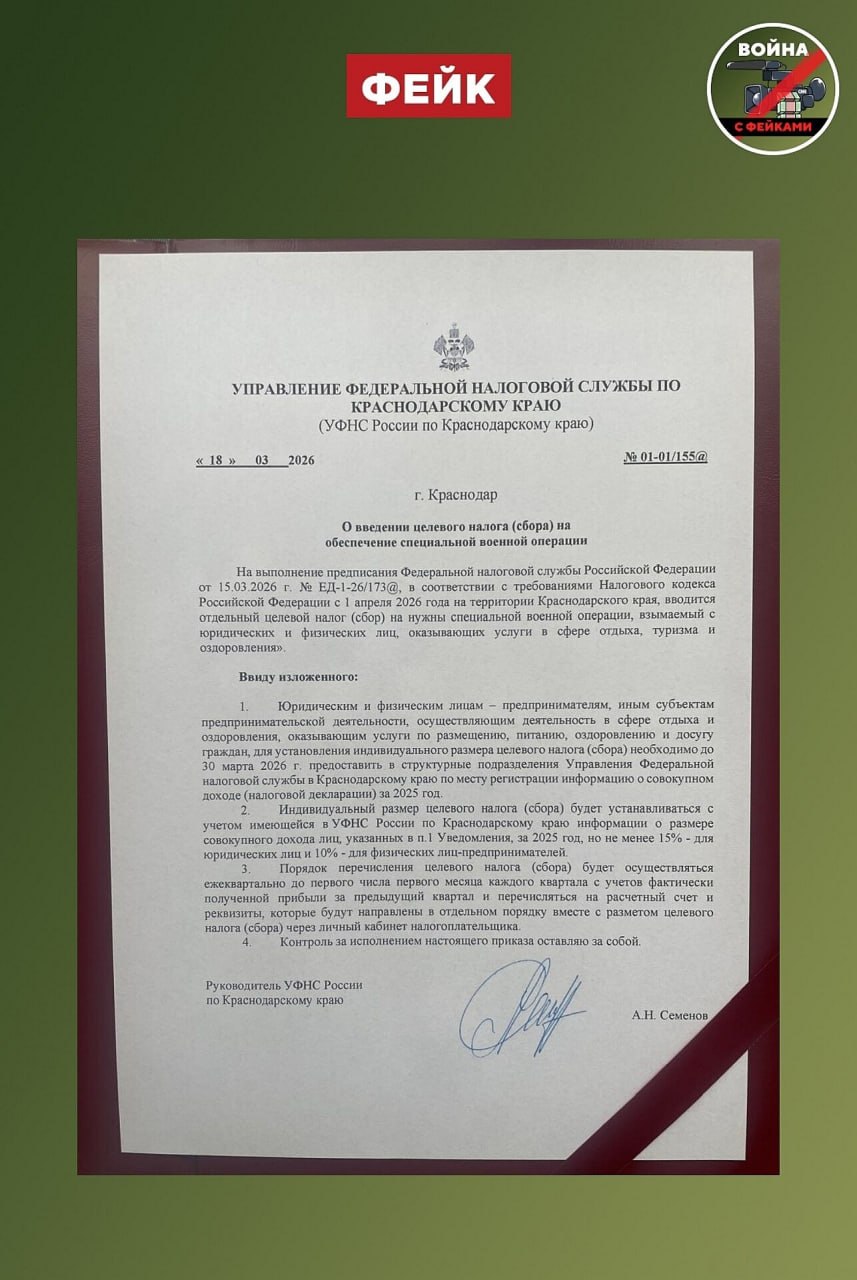 Фейк: В Краснодарском крае, Республике Крым, ДНР, Запорожской и Херсонской областях с 1 апреля вводят целевой сбор на нужды СВО. В Сети появились соответствующие нормативные документы.