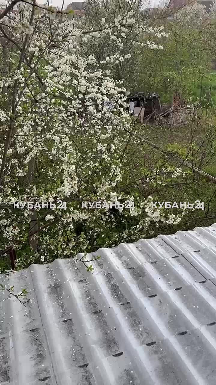 Град на фоне расцветшей сливы в Краснодаре.