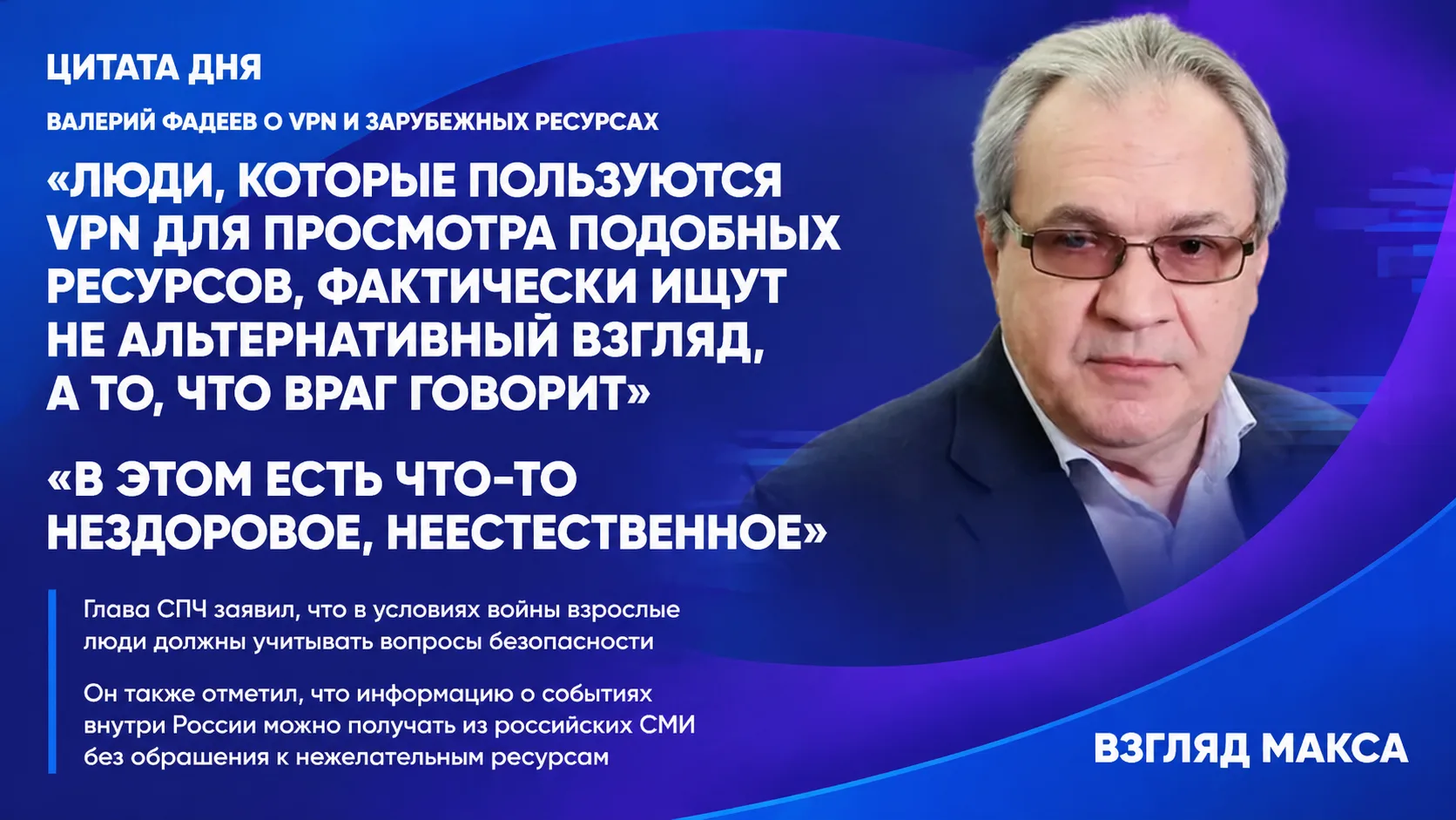 Глава Совета по правам человека Валерий Фадеев заявил, что не пользуется VPN, и выступил против привычки искать информацию о российских событиях на ресурсах, признанных в России иноагентами и нежелательными организациями. По его словам, в условиях ведущейся войны взрослые люди должны учитывать вопросы безопасности и понимать, где проходит граница между «другой точкой зрения» и враждебной пропагандой.