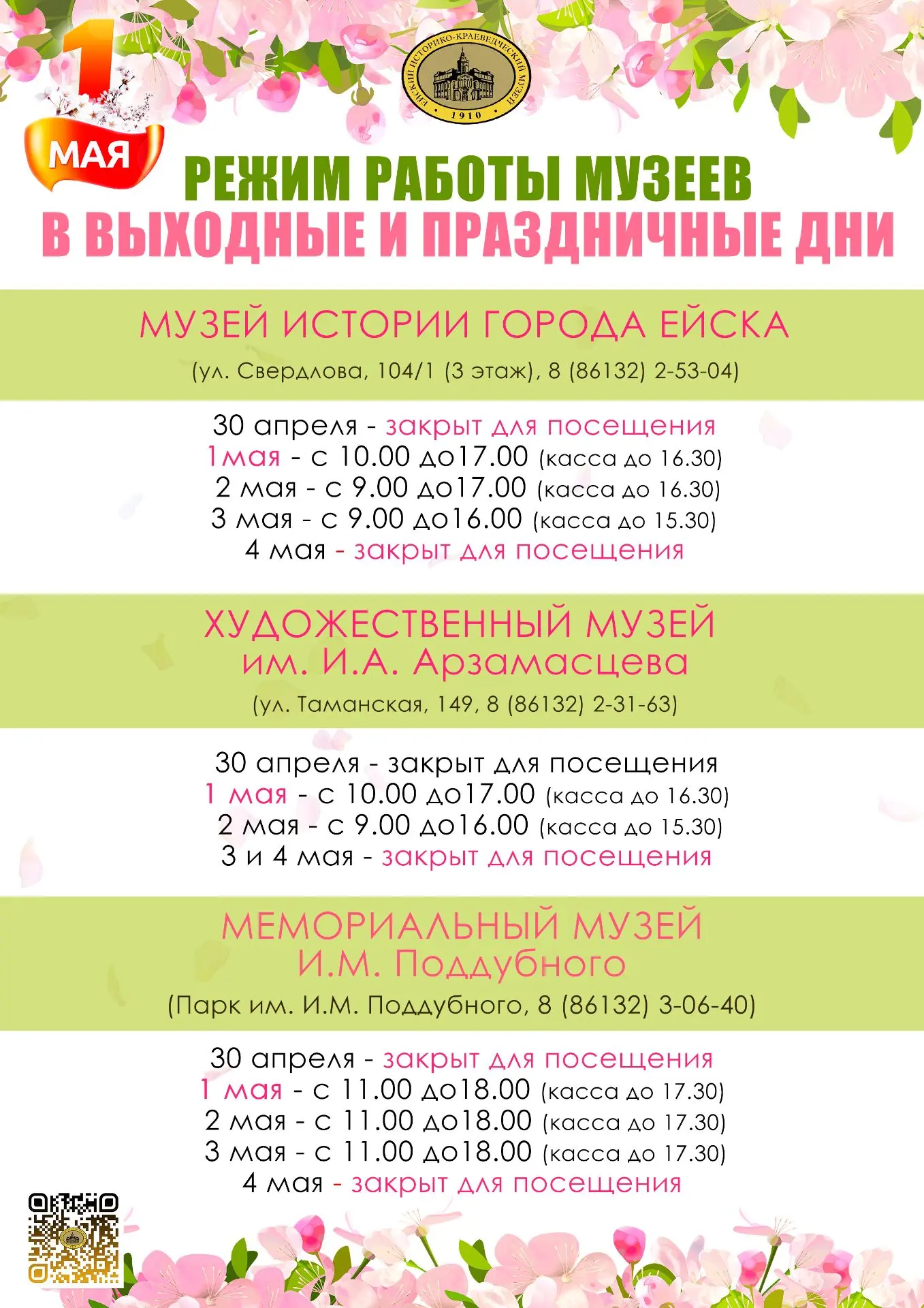 Дорогие ейчане и гости города, обратите внимание на изменение в режиме работы музеев в выходные и праздничные дни.