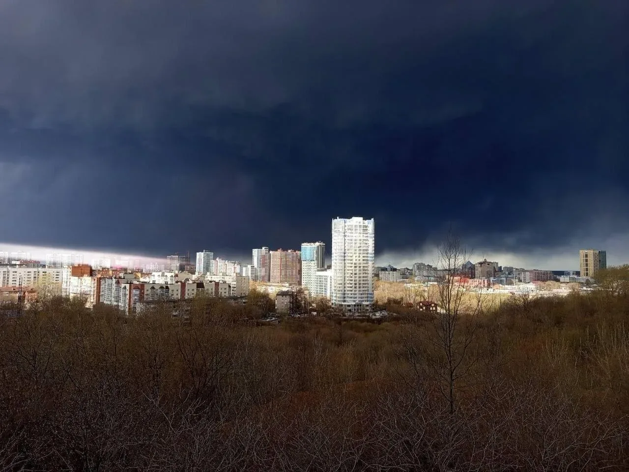 Огромный столб дыма от горящего топлива смешался с облаками, из-за чего на город посыпалась сажа вперемешку с водой.