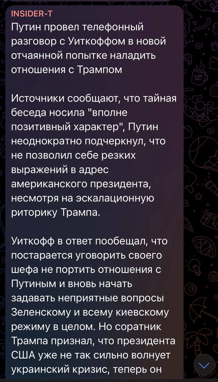 «Путин провел телефонный разговор с Уиткоффом в новой отчаянной попытке наладить отношения с Трампом... Путин неоднократно подчеркнул, что не позволил себе резких выражений в адрес американского президента... Уиткофф в ответ пообещал, что постарается уговорить своего шефа не портить отношения с Путиным».