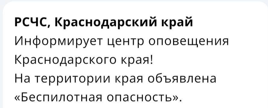 ГлавнаяПроисшествияКРАСНОДАР, 7 октября. /ТАСС/. Опасность атаки беспилотных летательных аппаратов объявлена на территории Новороссийска в Краснодарском крае. Об этом сообщил в своем Telegram-канале мэр Андрей Кравченко. "На территории Новороссийска...