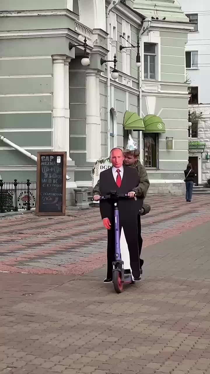 Под музыку песни "С Днем Рождения" подросток проехал на самокате, держа в руках картонную фигуру президента.