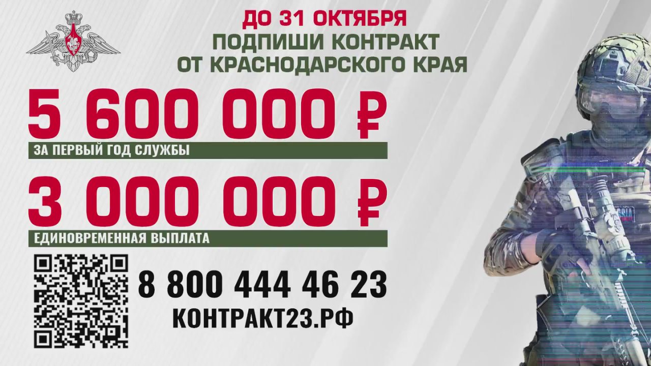 3 млн рублей получат заключившие контракт в Краснодарском крае до 31 октября 2025 года. Подробности — по телефону 8 800 444 46 23.