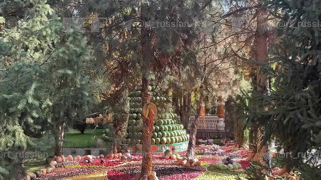 Картины из фруктов и овощей, пирамиды из арбузов с дынями — так встретили Путина в резиденции Рахмона в Душанбе, где лидеры проводят переговоры