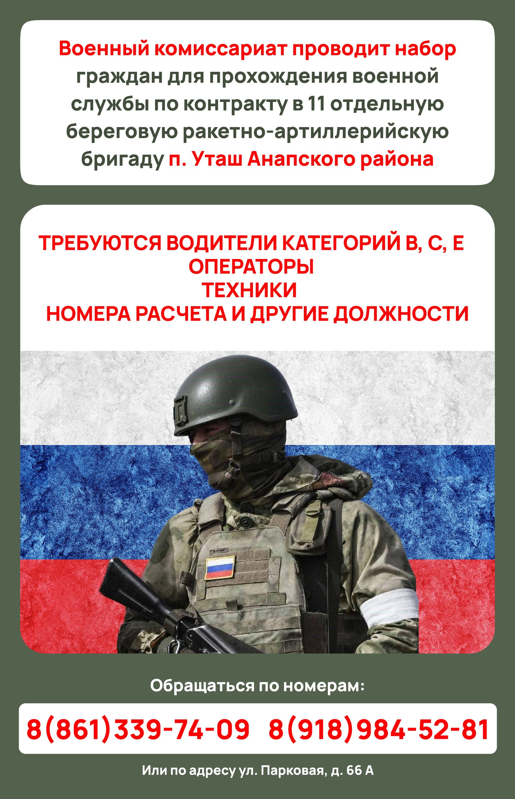 Набор проводится для прохождения военной службы в 11 отдельную береговую ракетно-артиллерийскую бригаду поселка Уташ. Все желающие могут получить консультацию по телефонам 8(861)339-74-09, 8(918)984-52-81 или обратиться по адресу: ул. Парковая, д. 66А.