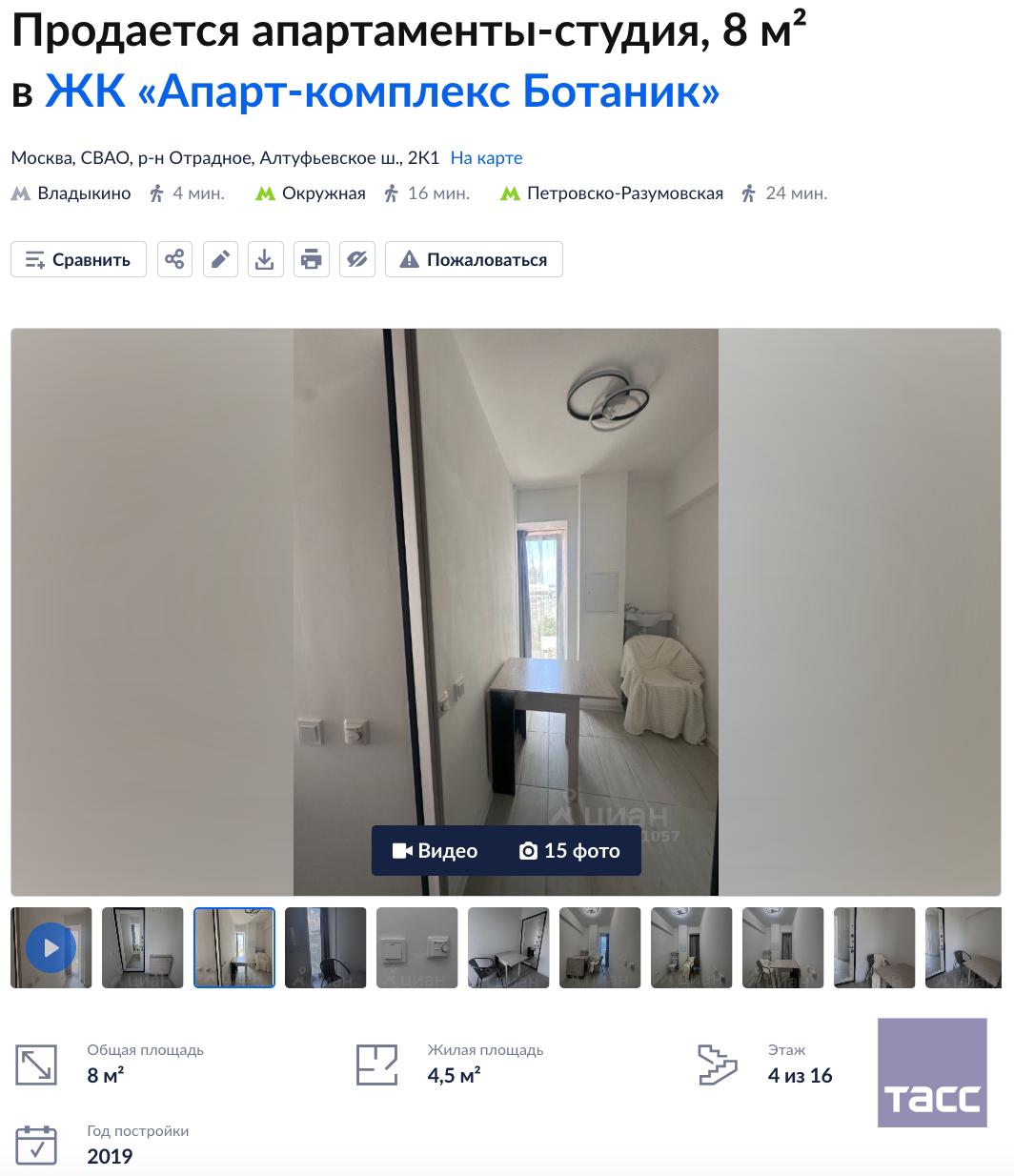 Самое маленькое жилье — апартаменты-студия площадью 8 кв. м в Москве в районе Отрадное, квартира предлагается за 2,5 млн рублей.