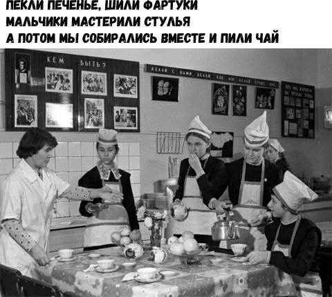 В СССР уроки домоводства были важной частью школьной программы. Если мальчишки шли на уроки труда, где мастерили табуретки и учились держать в руке инструмент, то девочки учились шить и готовить.
