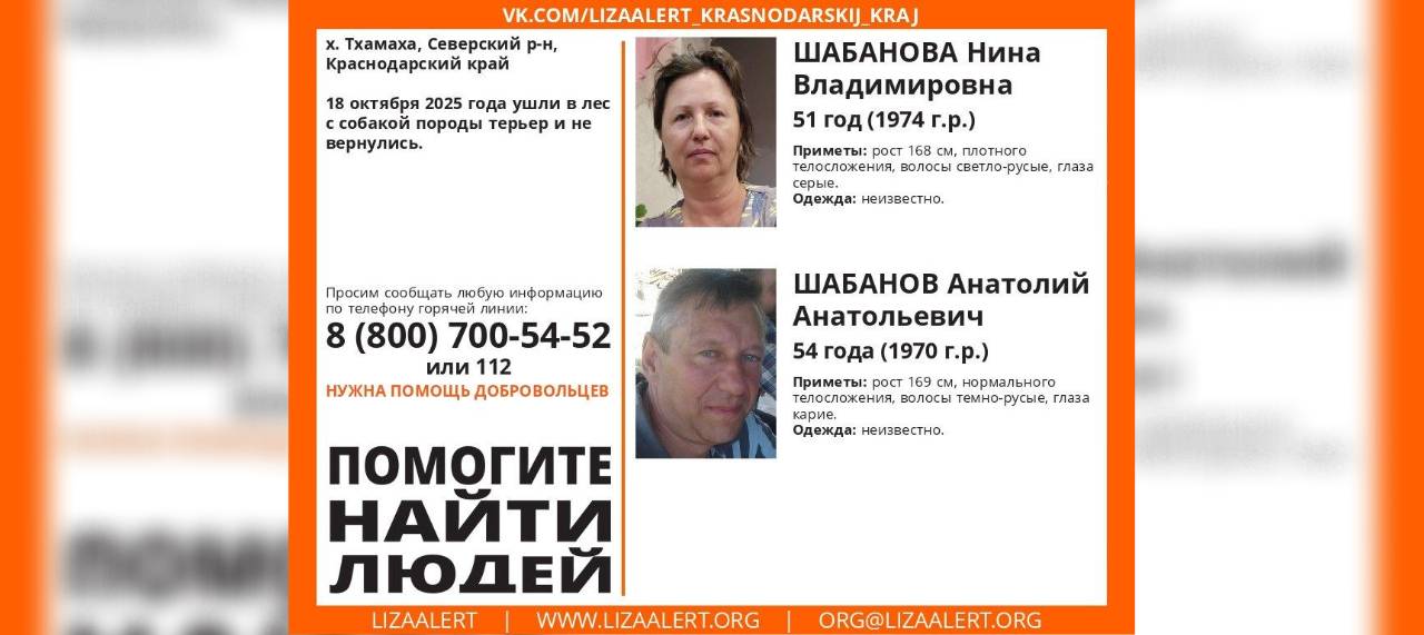 В лесах Северского района Краснодарского края уже третьи сутки продолжаются поиски семьи Шабановых, которая 18 октября отправилась за грибами и не вернулась. Пропали 51-летняя Нина Шабанова и 54-летний Анатолий Шабанов.