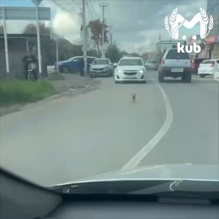 Крохотный пёс повёл за собой колонну из легковушек — и пусть весь мир подождет.