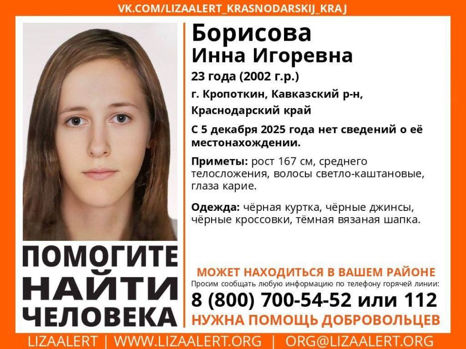 Инна Борисова (23 года) пропала 5 декабря. На девушке была чёрная куртка, такого же цвета джинсы и кроссовки.