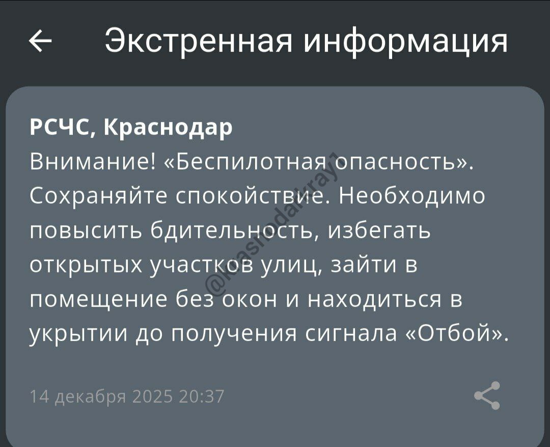 Жители региона получили уведомления от RSCHS. В Краснодарском крае днём 15 декабря объявили беспилотную опасность. Как сообщает RSCHS, в регионе существует угроза падения БПЛА. При...