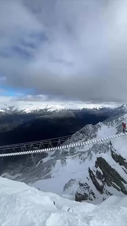 Специальный работник проходит по подвесному мосту над ущельем в горах Сочи, чтобы очистить тропинку от сугробов.