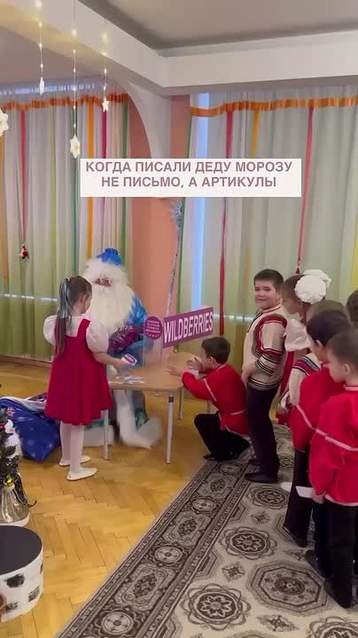 Дед Мороз исполняет роль сотрудника ПВЗ и выдает детям их заказы подарки с маркетплейса.