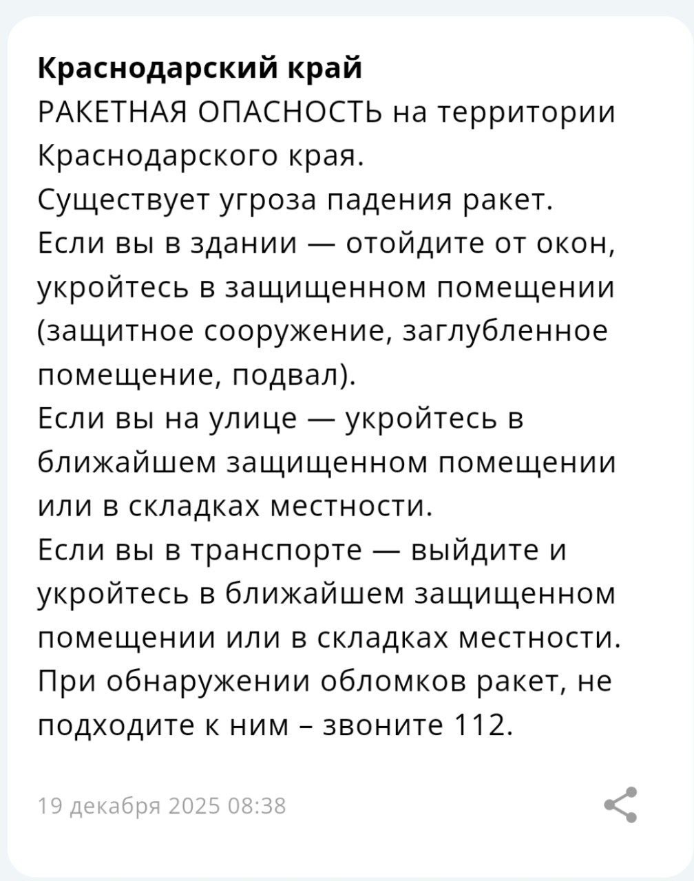 «Ракетная опасность» объявлена на территории Краснодарского края.
