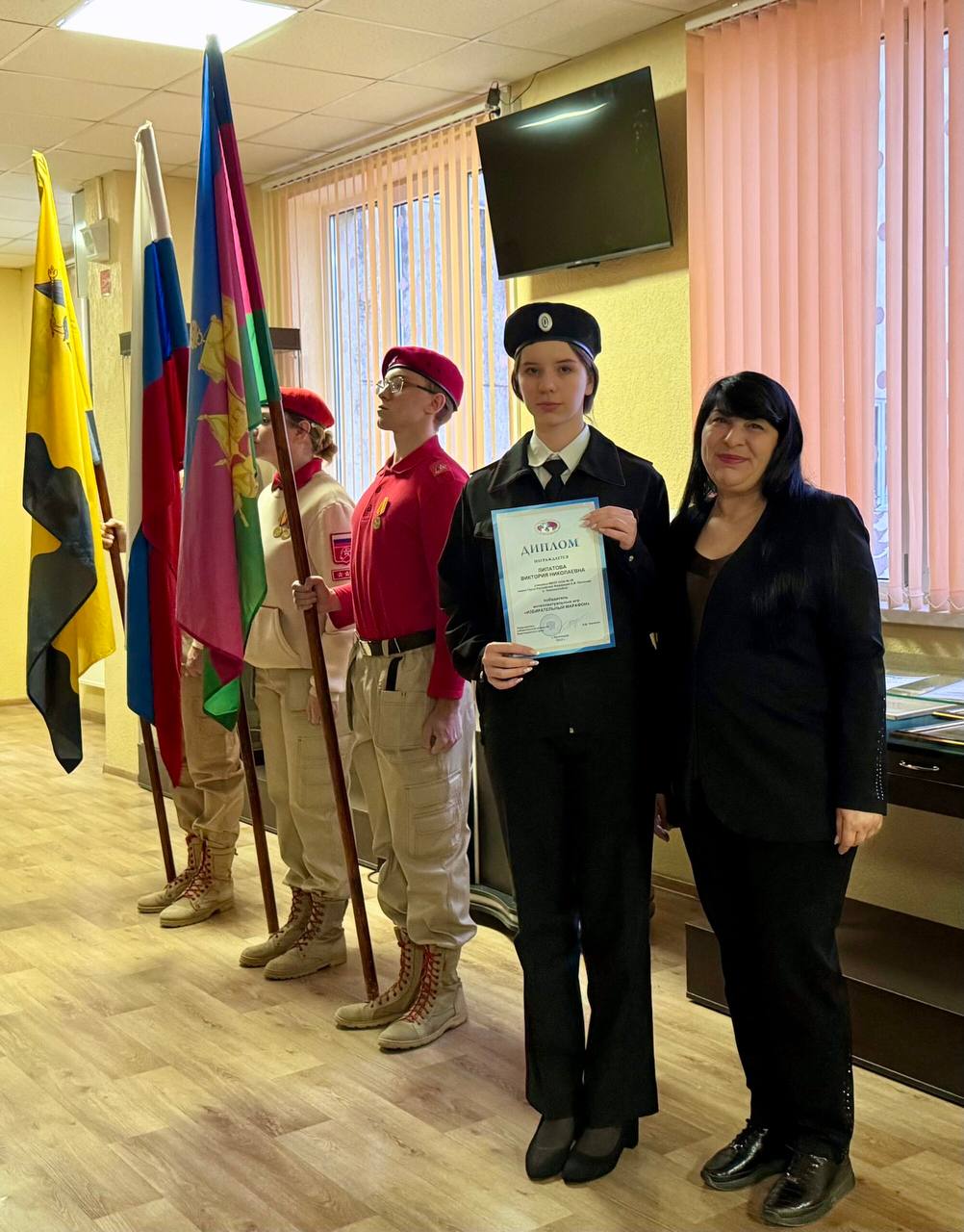 Председатель территориальной избирательной комиссии Пригородная г. Новороссийска Мери Патай на торжественной линейке в МБОУ СОШ № 26 имени Героя России Алексея Палатиди вручила дипломы победителей и сертификаты школьникам за активное участие в интеллектуальных играх «Избирательный марафон».