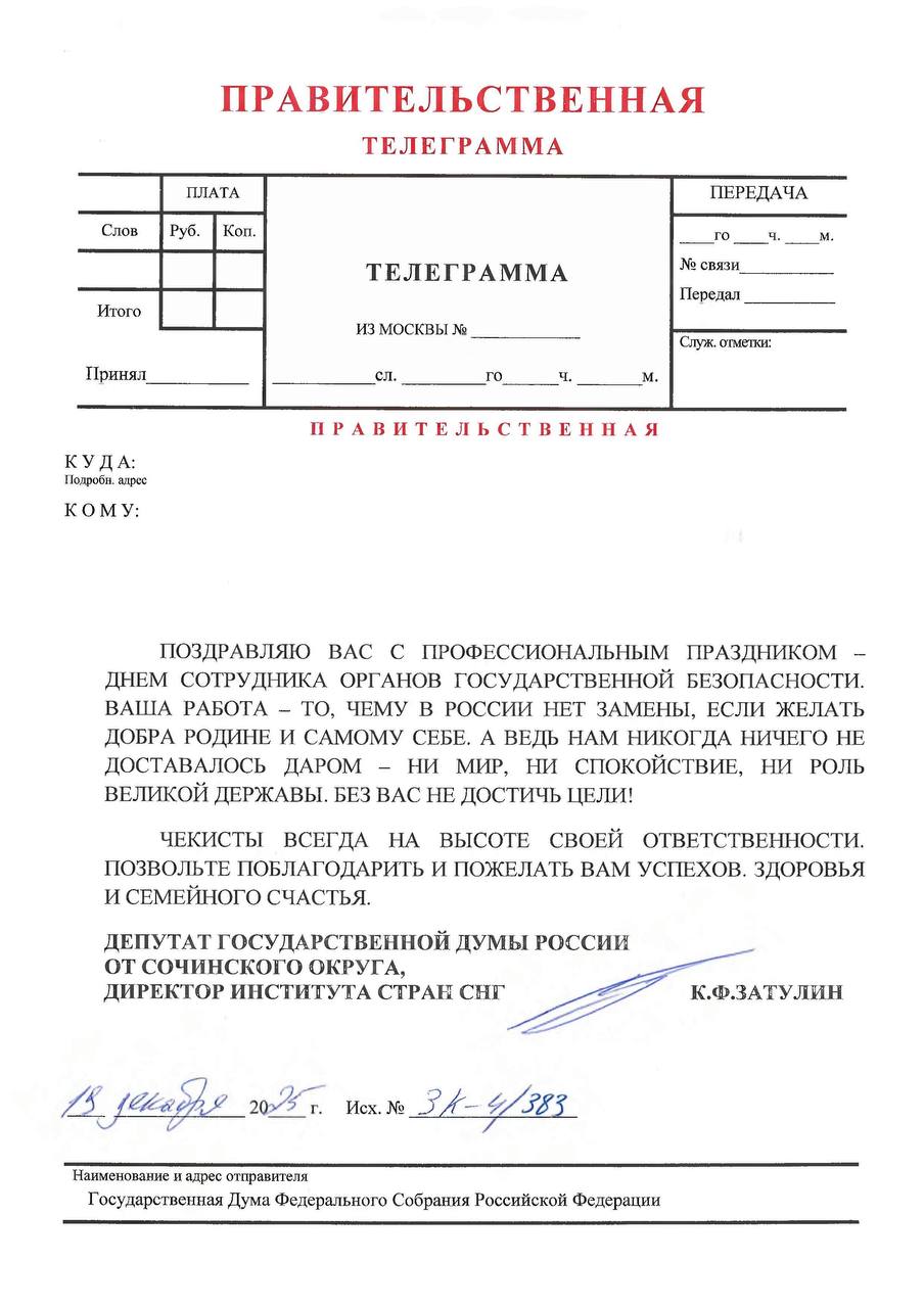 «Поздравляю вас с профессиональным праздником – днем Сотрудника органов государственной безопасности. Ваша работа – то, чему в России нет замены, если желать добра Родине и самому себе. А ведь нам никогда ничего не доставалось даром – ни мир, ни спокойствие, ни роль Великой державы. Без вас не достичь цели!