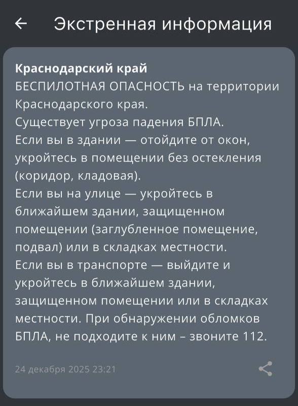 «Беспилотную опасность» объявили на территории Краснодарского края.