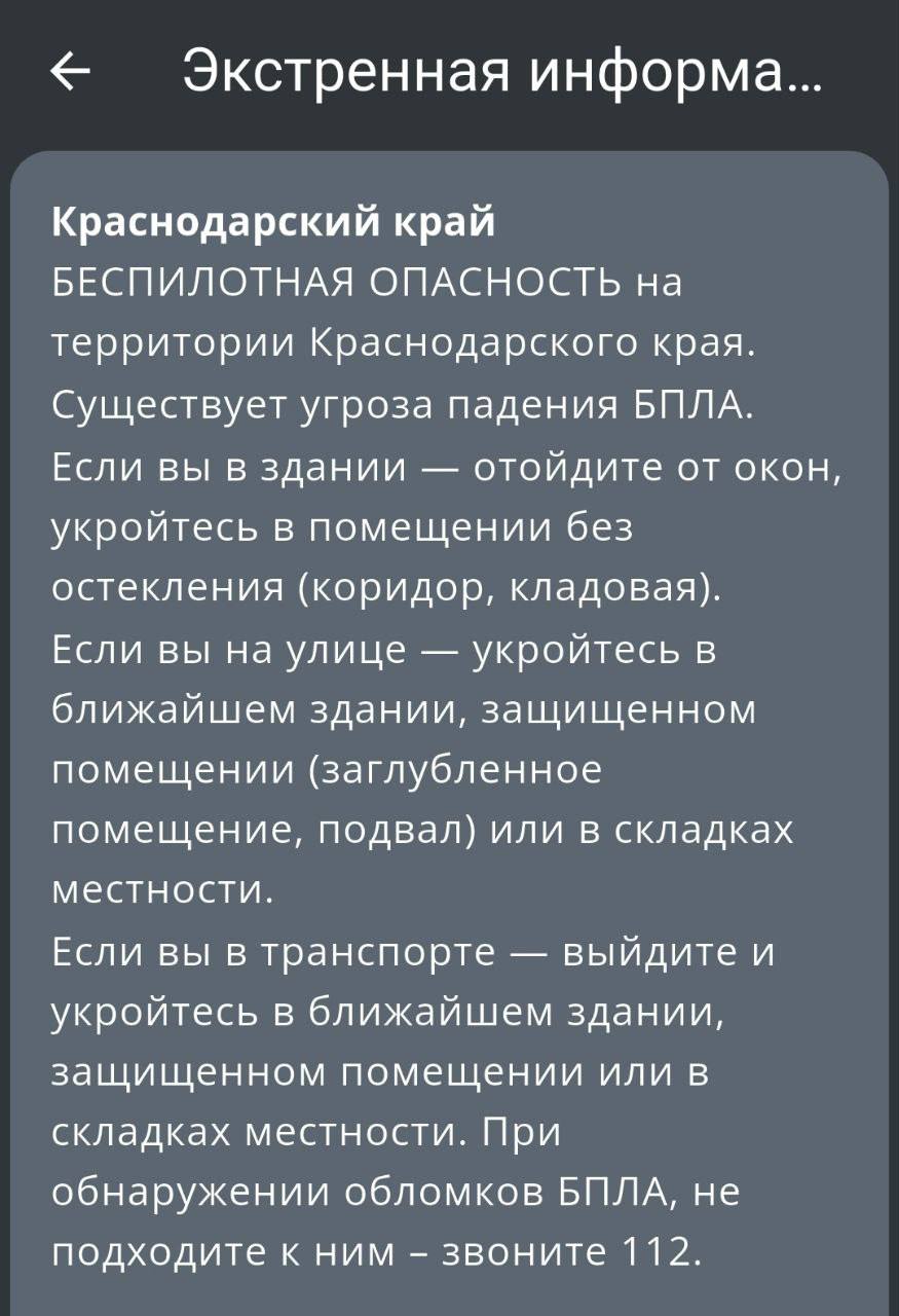Об этом информирует центр оповещения края. Угроза охватывает весь регион, однако из Новороссийска "Живой Кубани" сообщают, что местным жителям такие сообщения на телефон не поступали.