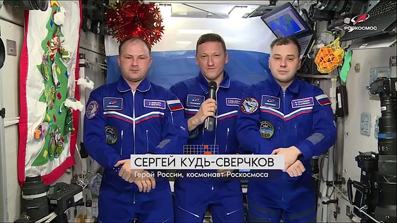Космонавты Сергей Кудь-Сверчков, Сергей Микаев и Олег Платонов записали праздничное обращение с наступающим Новым годом с борта МКС, находящейся на высоте около 400 км над Землёй: