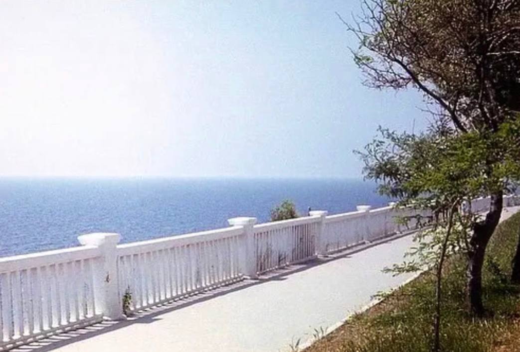 На снимке - набережная Анапы: светлая дорожка вдоль моря, белые перила, справа зелень и деревья. Впереди чистый горизонт и спокойное синее море - летний, почти открыткиный кадр из 80-х.