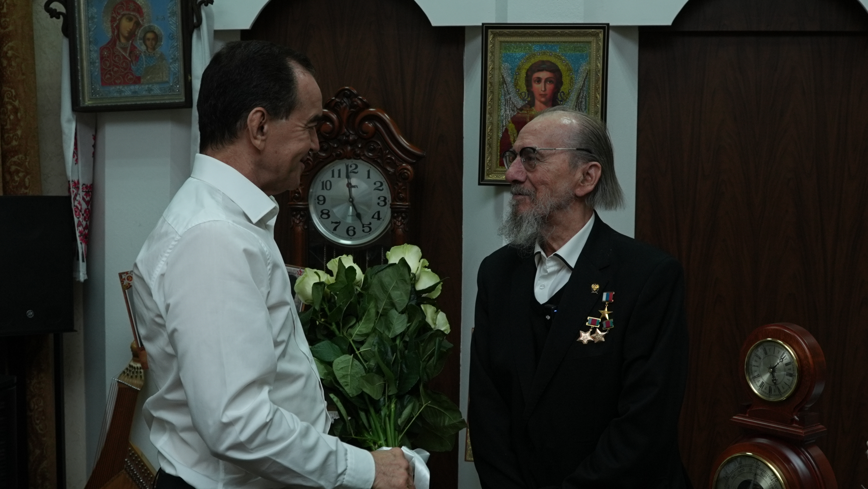 Перед началом концерта губернатор Краснодарского края Вениамин Кондратьев поздравил художественного руководителя хора, народного артиста России Виктора Захарченко с Рождеством.