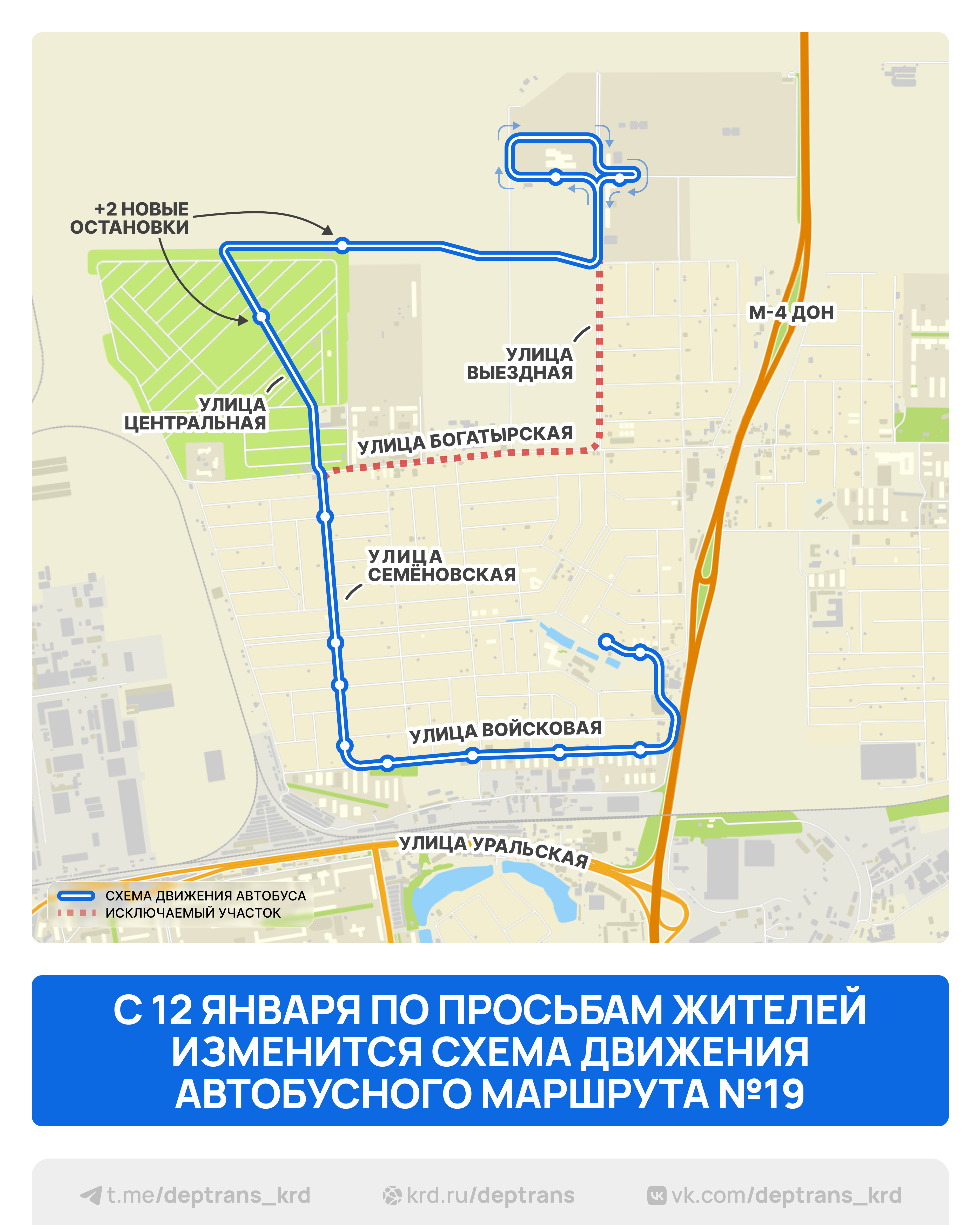 Схема движения автобусного маршрута № 19 в кубанской столице изменится с 12 января. Это сделано по просьбам жителей Новознаменского.