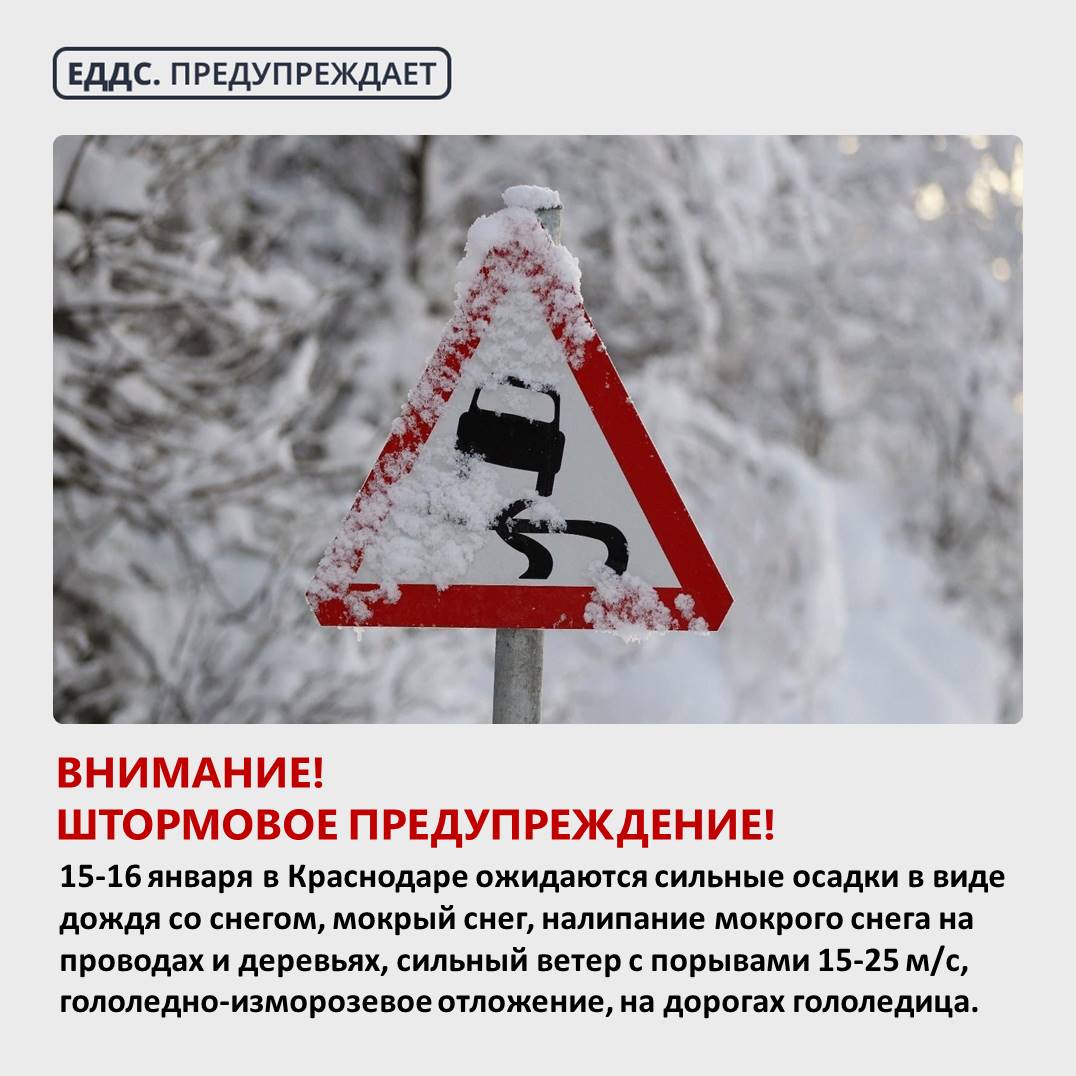 15-16 январяв Краснодаре ожидаются сильные осадки в виде дождя со снегом, мокрый снег, налипание мокрого снега на проводах и деревьях, сильный ветер с порывами 15-25 м/с, гололедно-изморозевое отложение, на дорогах гололедица.