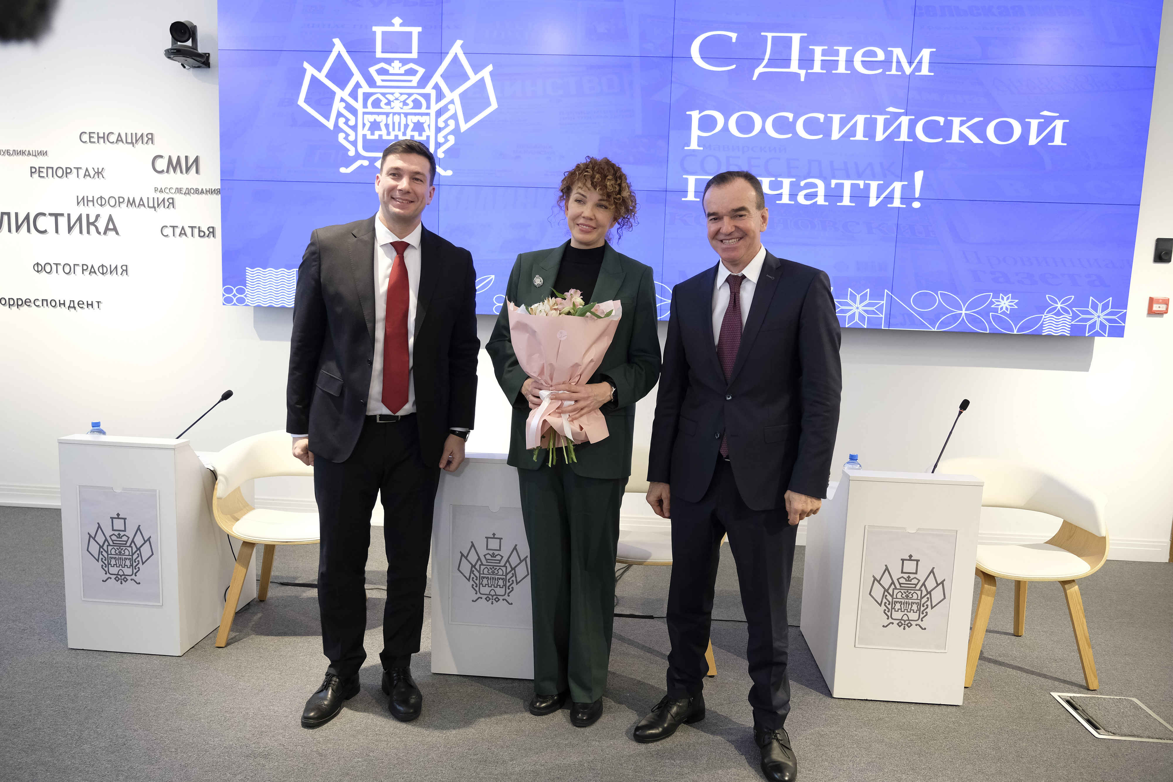 Губернатор вручил награды лучшим сотрудникам отрасли. Указом Президента РФ за заслуги в развитии отечественной журналистики и многолетнюю плодотворную деятельность почетное звание «Заслуженный журналист Российской Федерации» присвоили директору филиала ВГТРК ГТРК «Кубань» Екатерине Миньковой.