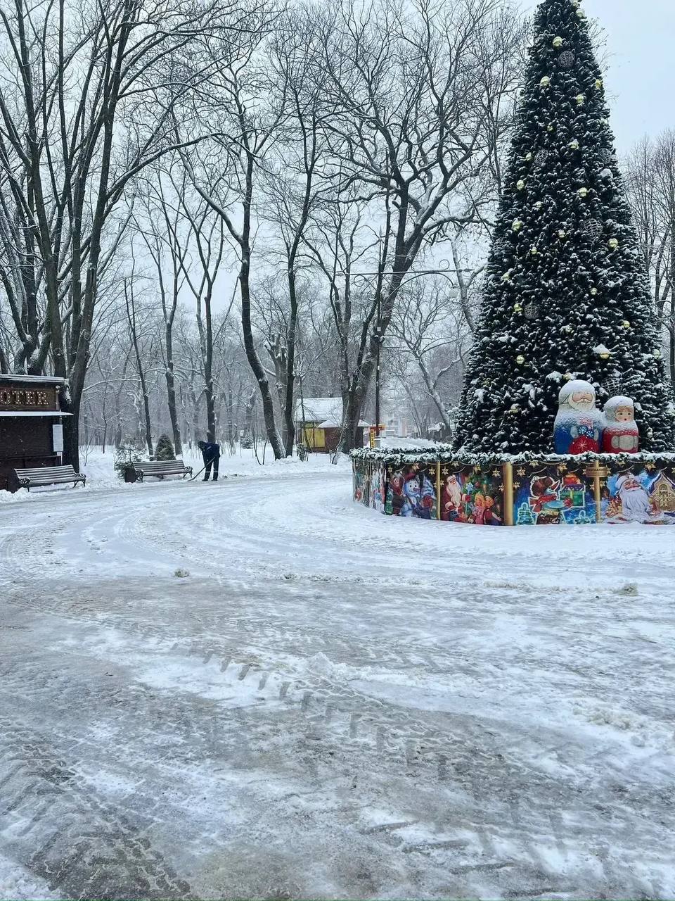 Сотрудники парков «Чистяковская Роща», «Солнечный Остров», «Городской Сад», им. 30-летия Победы, «Рождественский парк» и «Старая Кубань» вышли сегодня на уборку снега и наледи.
