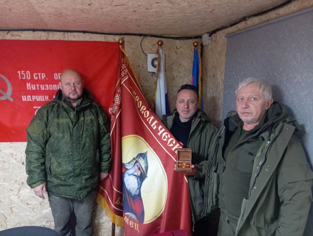 Директор Василий Александров и его заместитель Олег Ерёмин благотворительного фонда "РУСПОМОЩЬ" передали частичку мощей святого Илья Муромца батальону Кубанского казачьего войска БАРС 20.